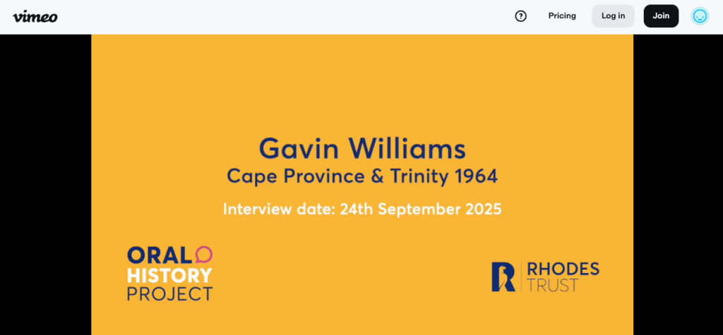 This interview with Gavin Williams, recorded for the Rhodes Trust Oral History Project, reflects on his life, work, and experiences as a Rhodes Scholar and academic. The interview combines a written conversation with a short film, offering a thoughtful account of his intellectual journey, teaching, and research across different places and contexts.